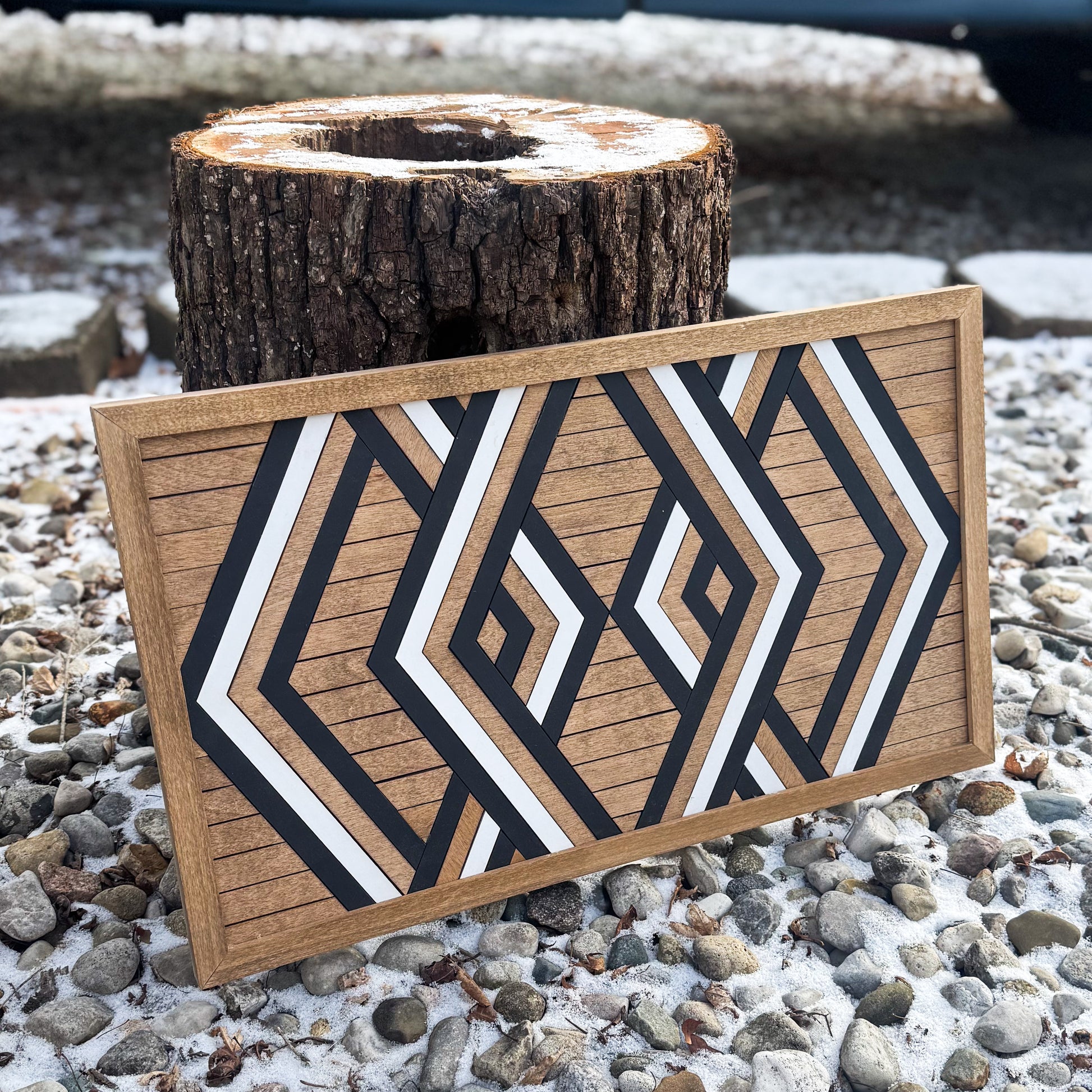This bold geometric wood wall art features a repeating chevron and diamond pattern in warm hardwood tones with black and white accents. It can be displayed vertically or horizontally, making it an easy fit for different spaces and styles. Each piece is cut, assembled, and framed by hand, giving it a clean, modern look with the warmth and character of real wood. Perfect for adding a little edge and texture to a living room, office, or entryway. Measures 23x13"